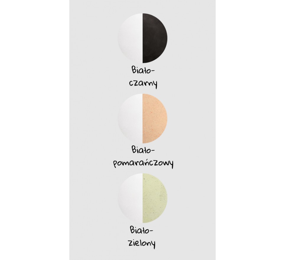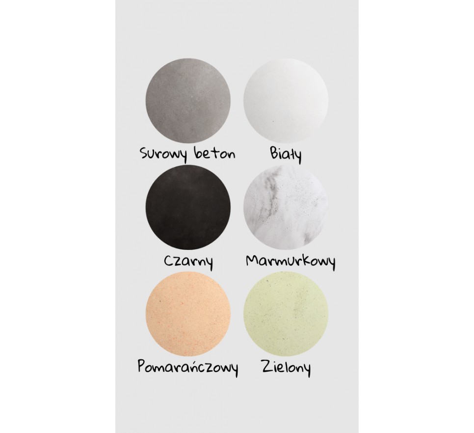 Surowy beton, biały, czarny, marmurkowy (biały połączony z czarnym), pastelowo pomarańczowy, pastelowo zielony, biało‑czarny, biało‑zielony, biało‑pomarańczowy