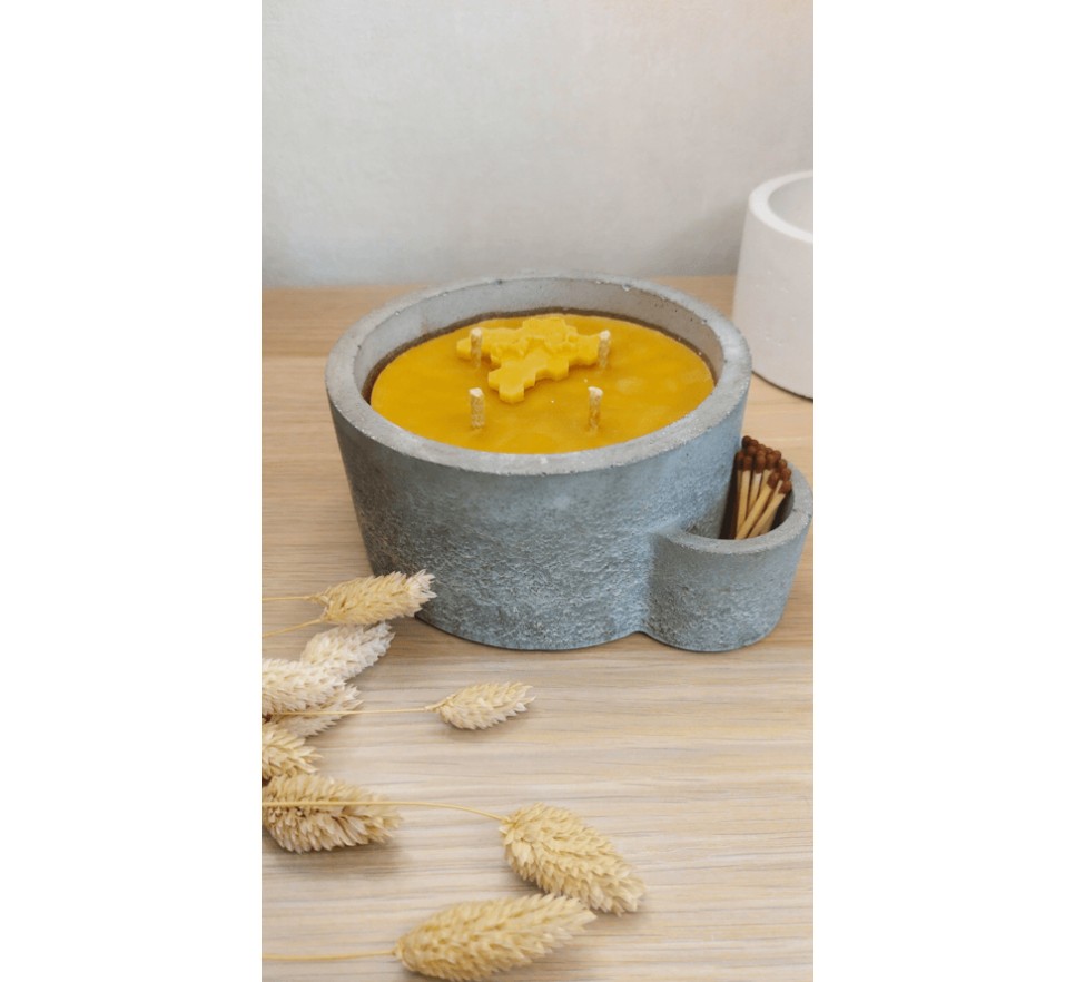 Okrągła świeca z wosku pszczelego XXL w betonowej osłonce – elegancka i naturalna dekoracja, która łączy surowy beton z ciepłem zapalonej świecy. Wykonana w 100% z polskiego wosku pszczelego, bez dodatków zapachowych i barwników.