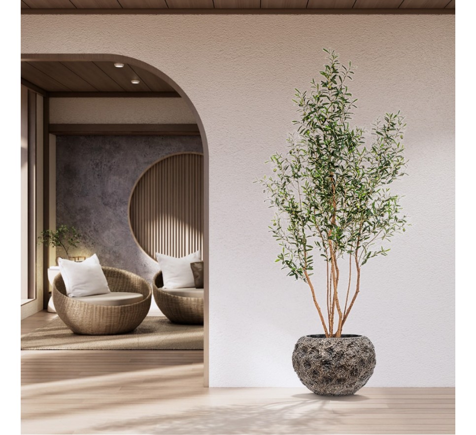 Naturalny Pień: Sercem tej kompozycji jest starannie dobrany, autentyczny pień, który wiernie oddaje teksturę i wygląd prawdziwego drzewa oliwnego.