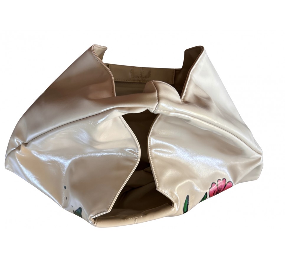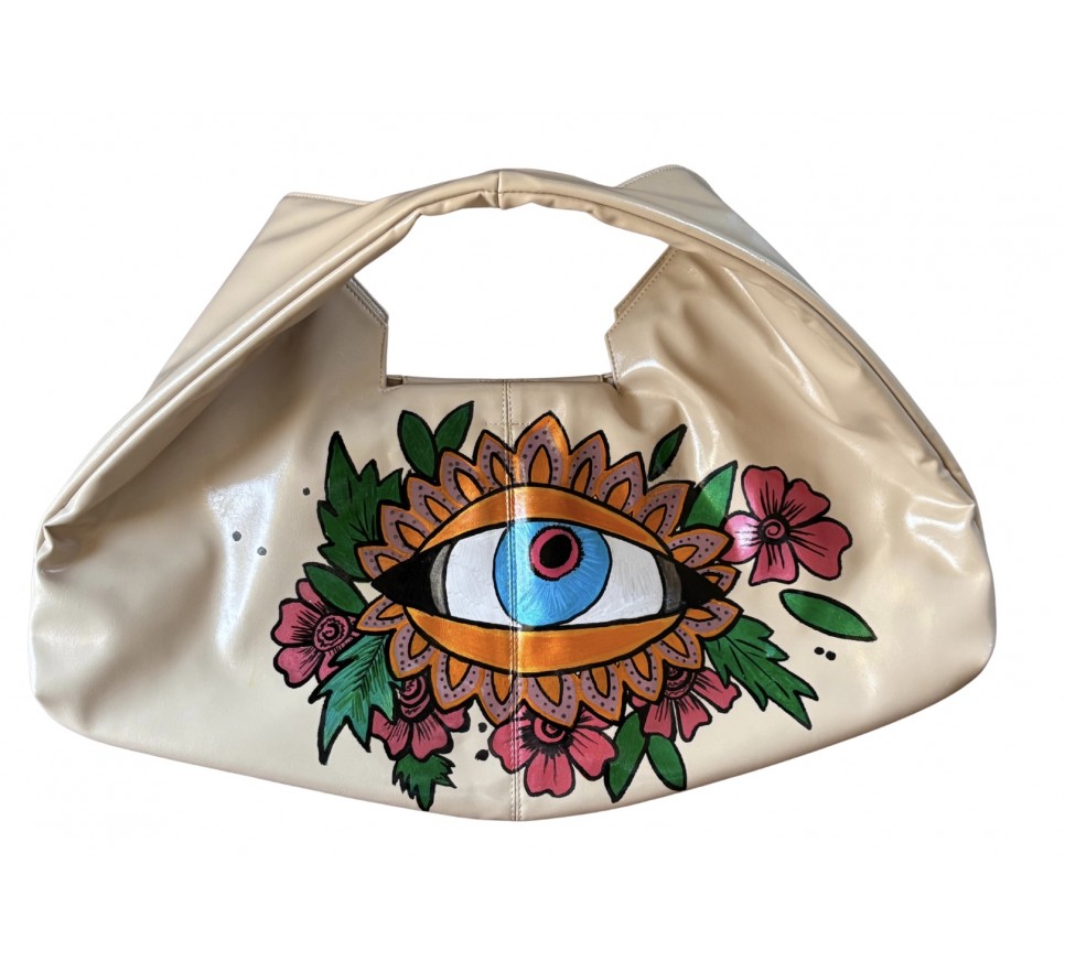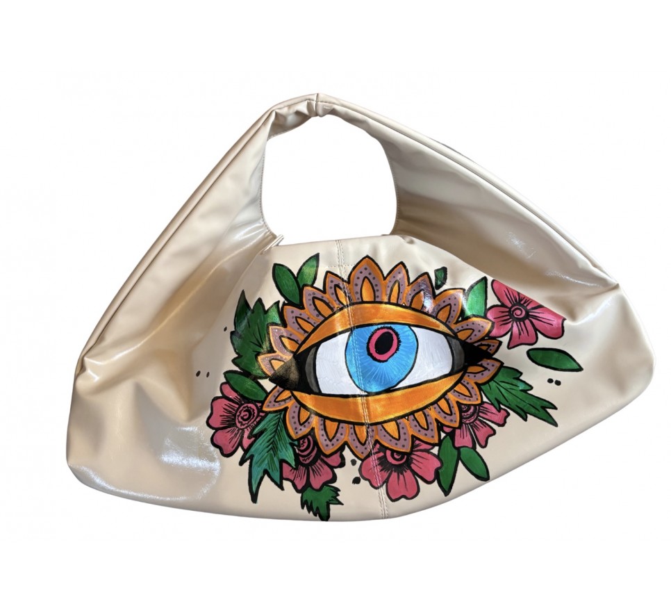 Proponowany produkt to torba „OJO”. Beżowa torba z eko skóry, ozdobiona autorską grafiką.
