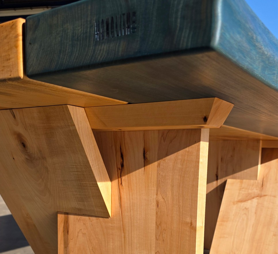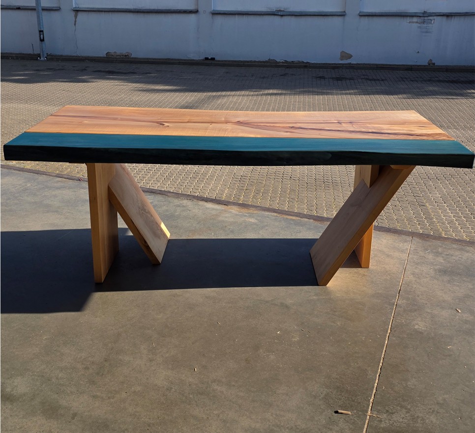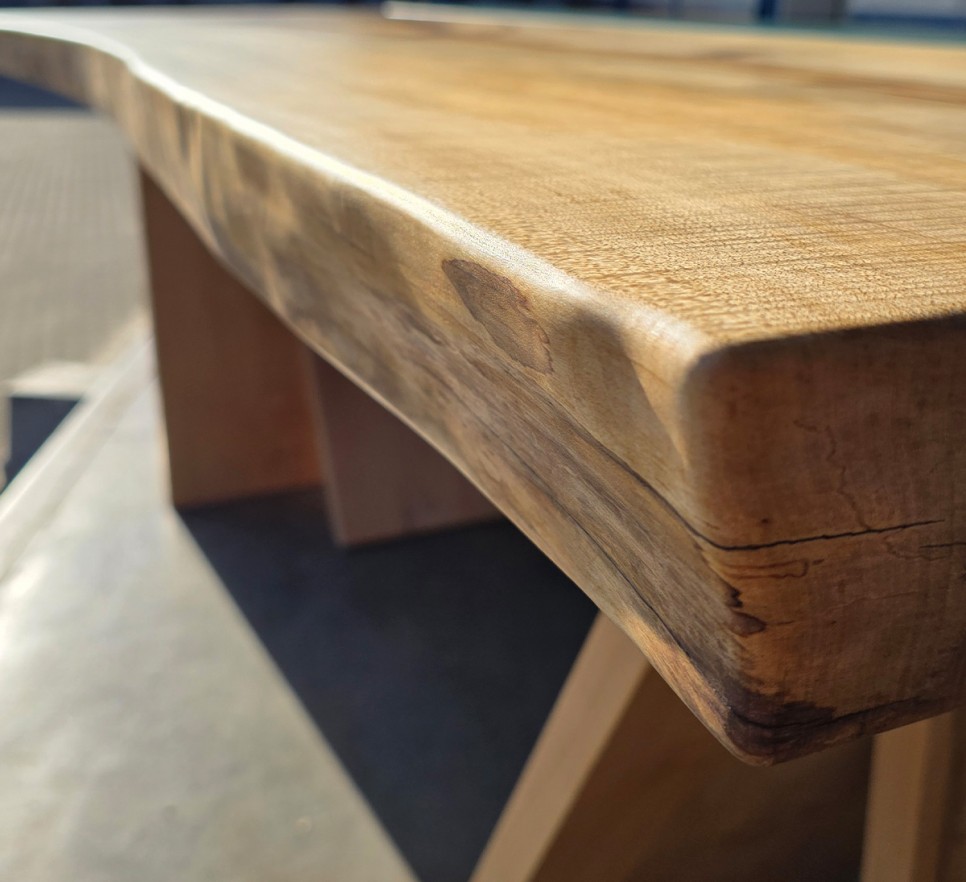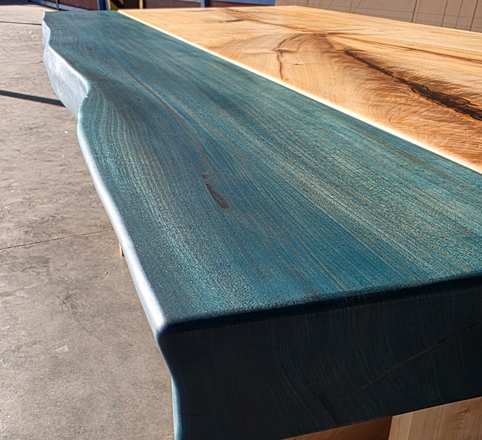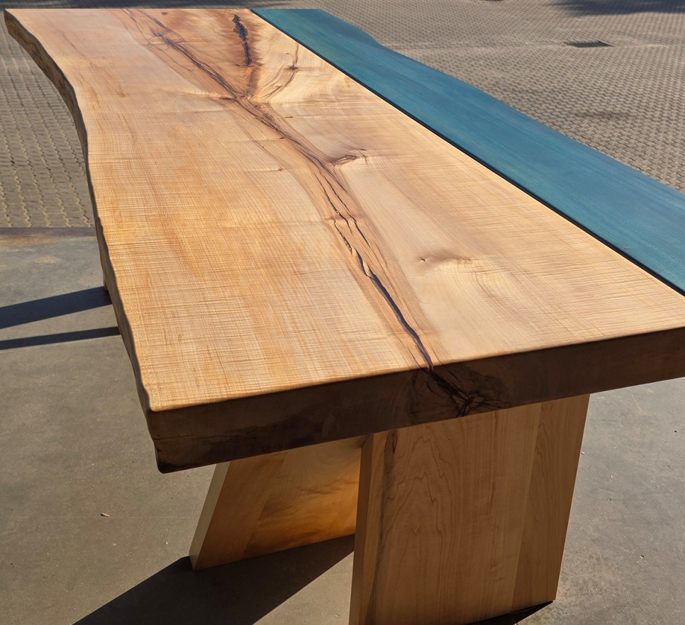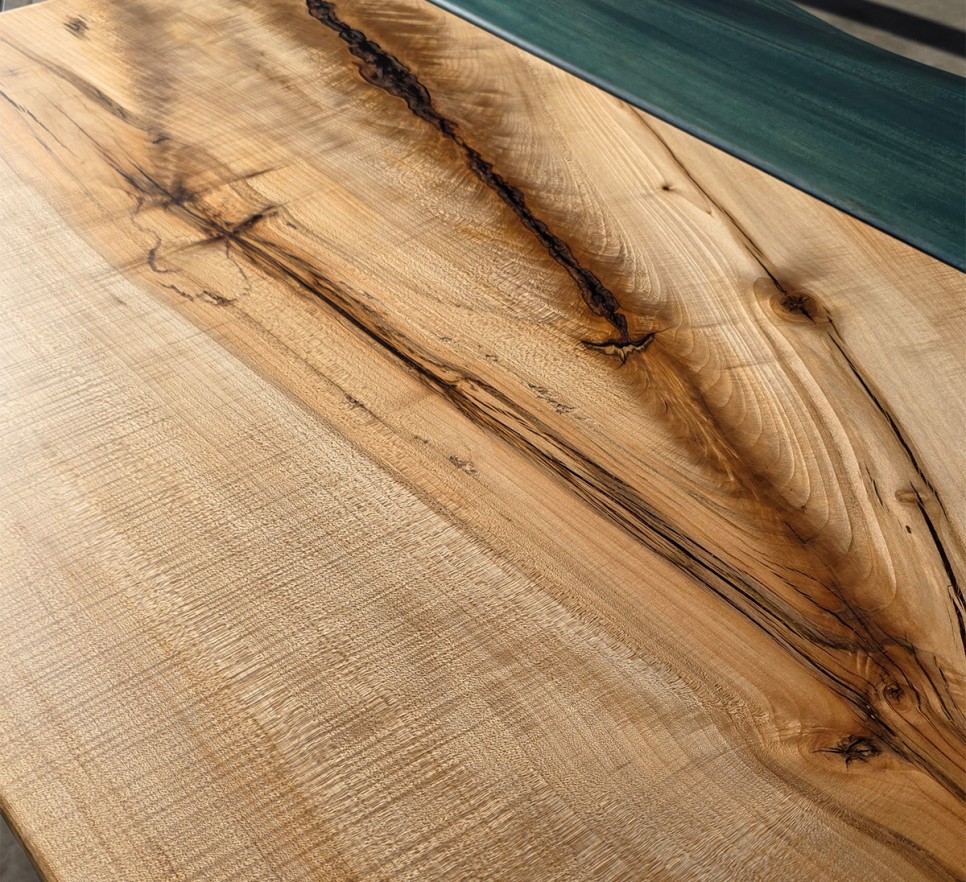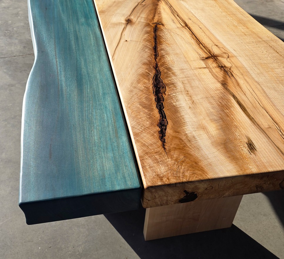 Woda i drewno. Ten piękny stół to unikatowy egzemplarz Monolith Wood – dwa żywioły połączone w odważnej formie. Wykonany z klonu i wiązu o naturalnej krawędzi, wykończony najwyższej jakości olejem Rubio Monocoat, podkreśla indywidualny charakter drewna. Każdy egzemplarz jest niepowtarzalny.