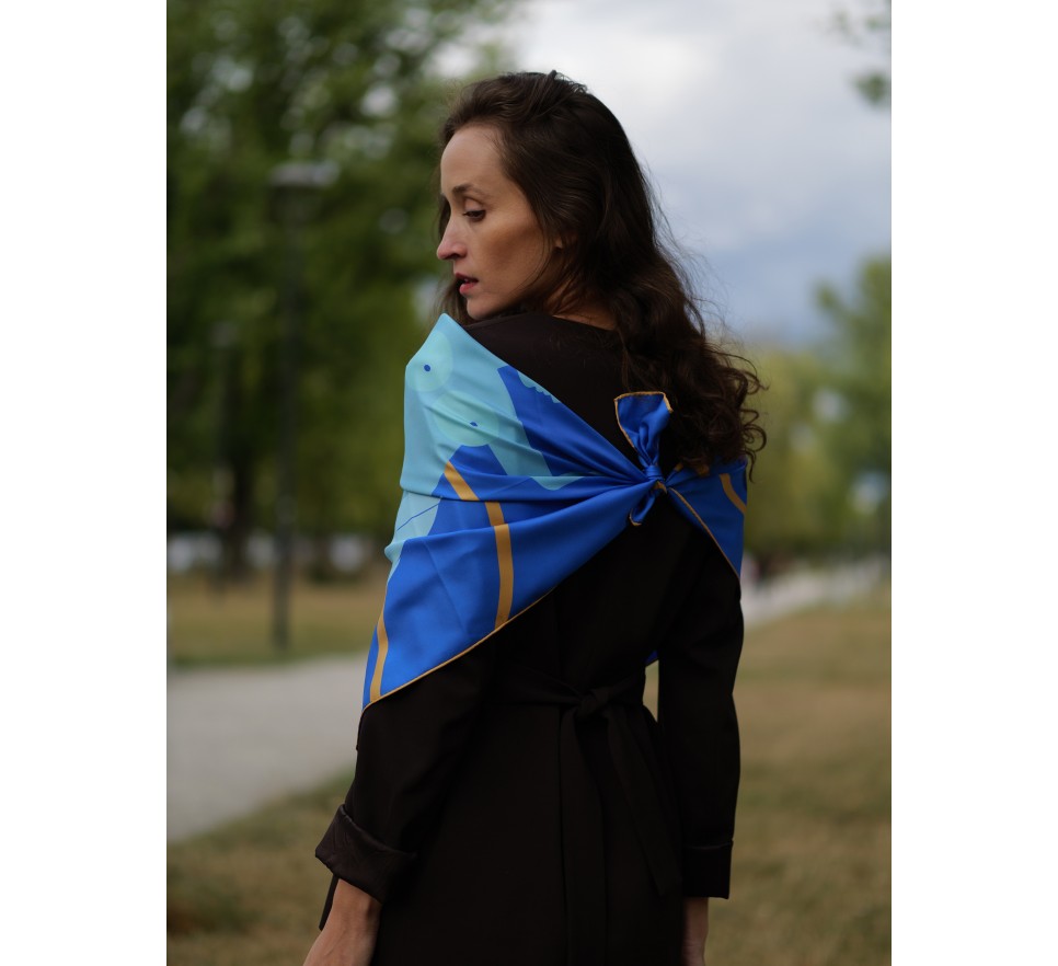 Apaszka została wykonana z mięsistego jedwabnego twillu, znanego z eleganckiego połysku i luksusowej struktury. Gęsty, szlachetny splot sprawia, że materiał pięknie układa się na sylwetce, zachowuje formę i objętość, a przy tym prezentuje się spektakularnie niezależnie od sposobu noszenia. To jedwabny dodatek, który łączy jakość, tradycję i współczesną estetykę.