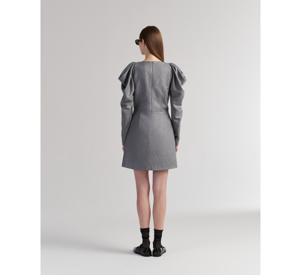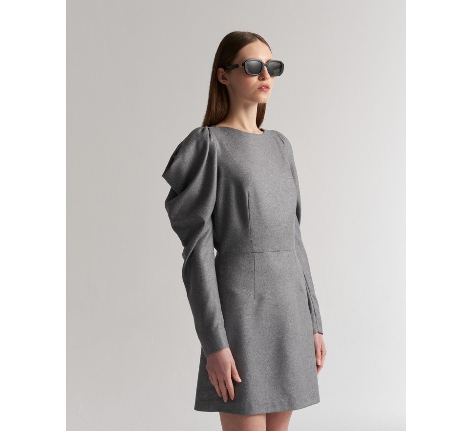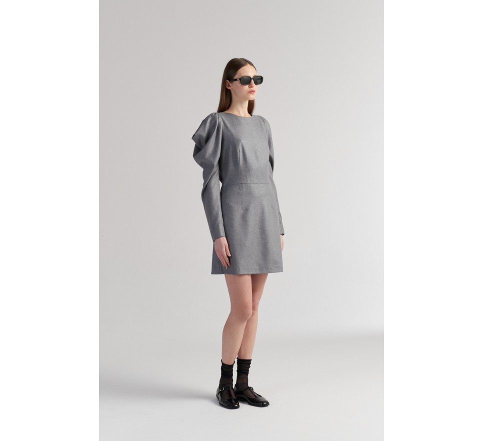 Sukienka Manche Grey jest odcinana w pasie i ma prostą formę w kształcie litery A. Charakterystycznym detalem jest rękaw, który można dowolnie formować. Jednym z efektów ułożenia rękawa jest uzyskanie kształtu kwiatu róży. Sukienka jest zapinana z tyłu na zamek, lekko taliowana, wysmukla, podkreśla sylwetkę i wydłuża nogi. Dzięki podszewce doskonale dopasowuje się do sylwetki, tworząc idelaną figurę. Fason eksponuje subtelnie sylwetkę. Model Manche Bourette Grey wyróżnia się wyjątkową tkaniną. Faktura jedwabiu Bourette przypomina len. Połączenie ekskluzywności tkaniny oraz jedwabnej podszewki sprawia, że sukienka jest doskonałym odzwierciedleniem stylu quiet luxury. Tkanina koloru jasnej szarości wygląda zjawiskowo, a jedwabne nitki, które lekko odbijają światło potęgują ten efekt.