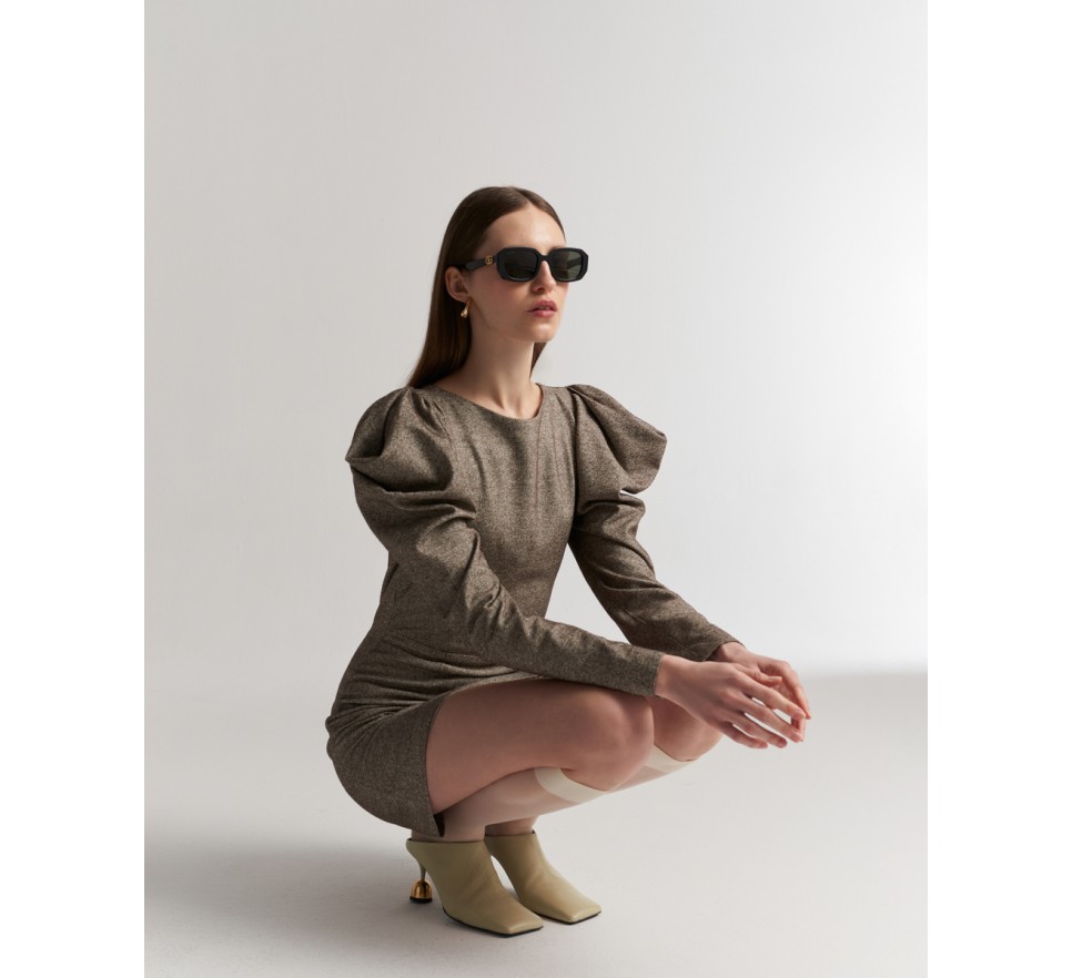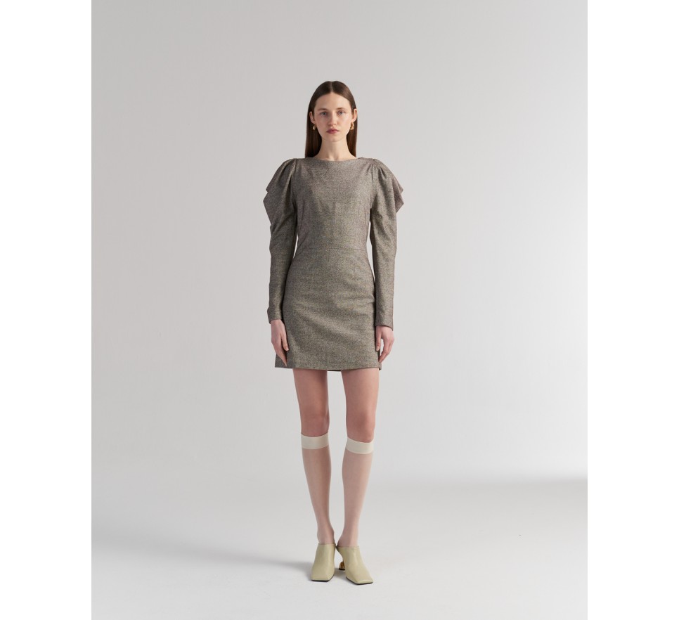 Sukienka Manche Tweed jest odcinana w pasie i ma prostą formę w kształcie litery A. Charakterystycznym detalem jest rękaw, który można dowolnie formować. Jednym z efektów ułożenia rękawa jest uzyskanie kształtu kwiatu róży. Sukienka jest zapinana z tyłu na zamek, lekko taliowana, wysmukla, podkreśla sylwetkę i wydłuża nogi. Dzięki podszewce doskonale dopasowuje się do sylwetki, tworząc idelaną figurę. Fason eksponując subtelnie sylwetkę. Model Manche Tweed to propozycja z wyjątkowej tkaniny wełniano-jedwabnej w kolorze melanżowym tzw. sól i pieprz w połączeniu z żakardową podszewką o motywie kwiatowym.