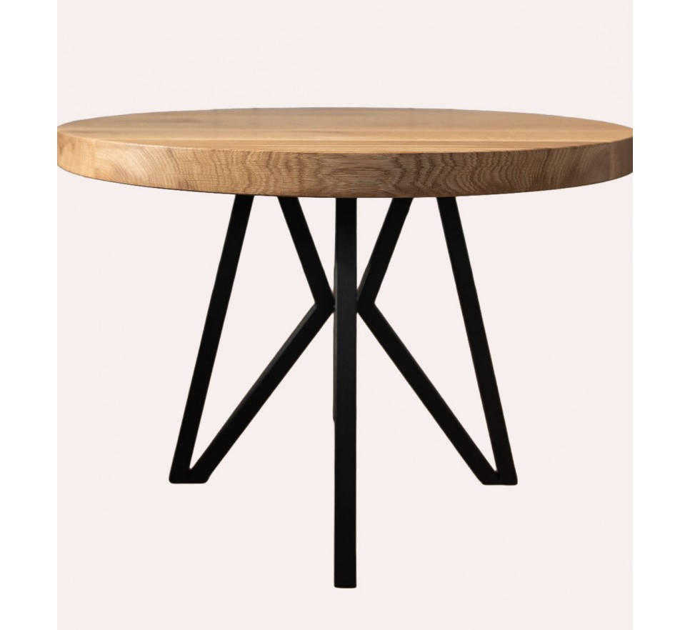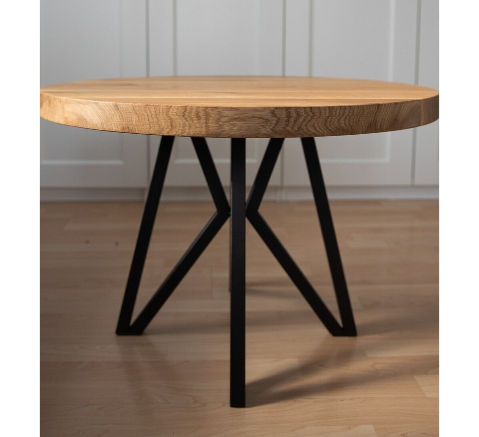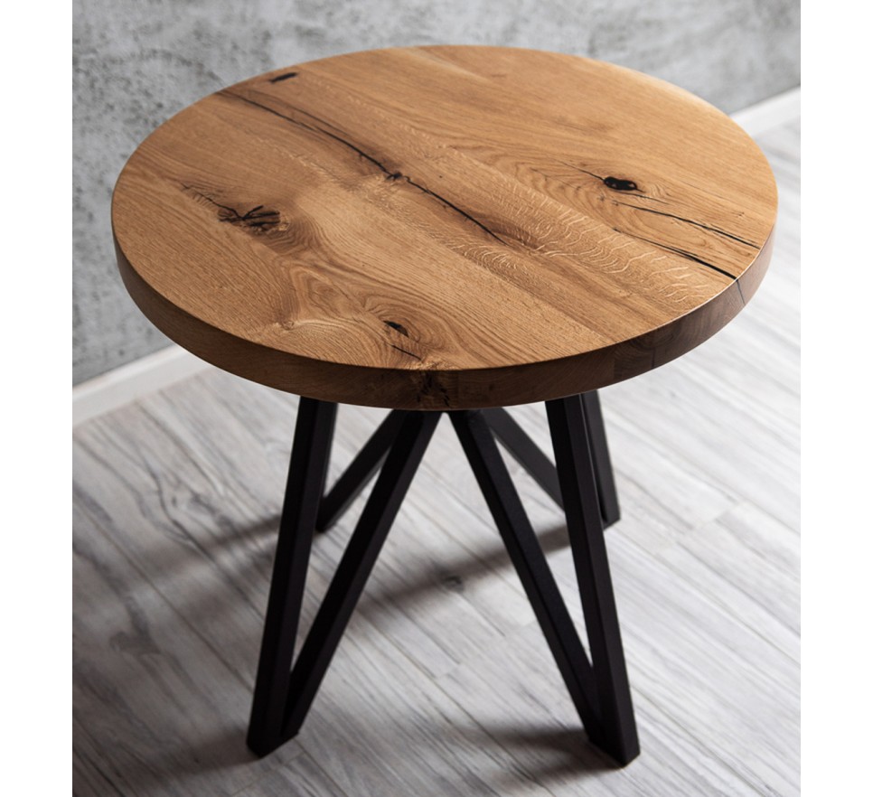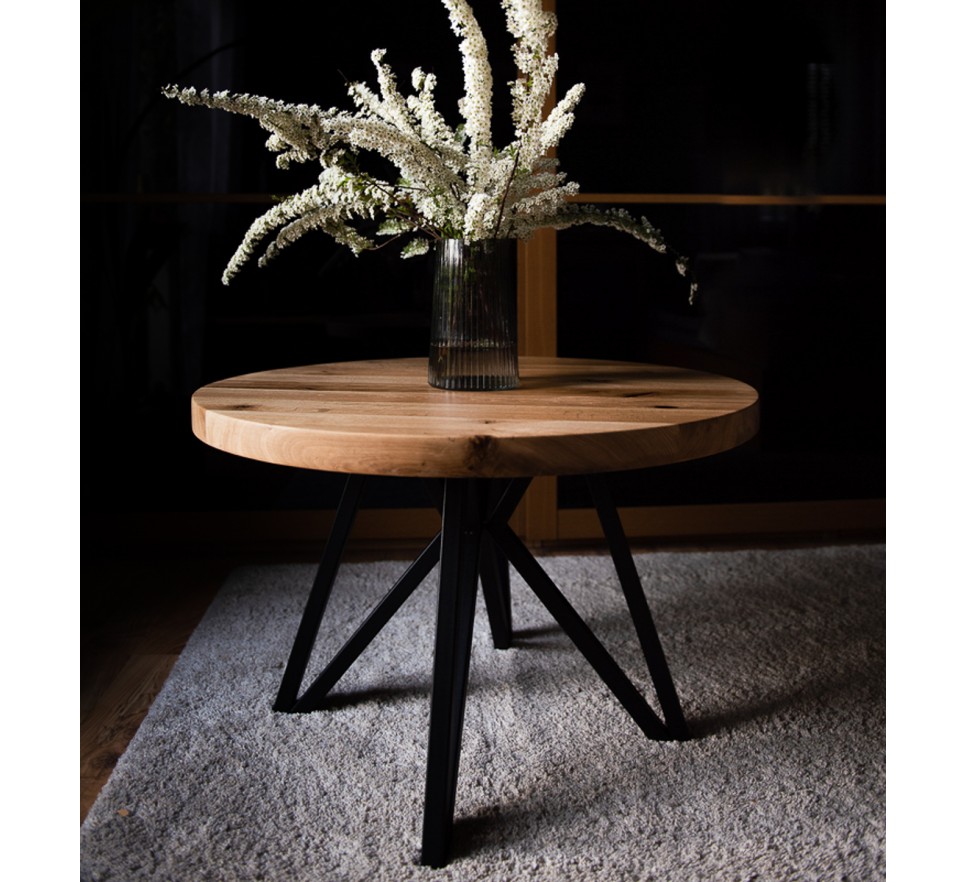 Okrągły stolik z blatem z litego drewna dębowego z wstawkami z czarnej żywicy. Metalowe nogi malowane są proszkowo.
