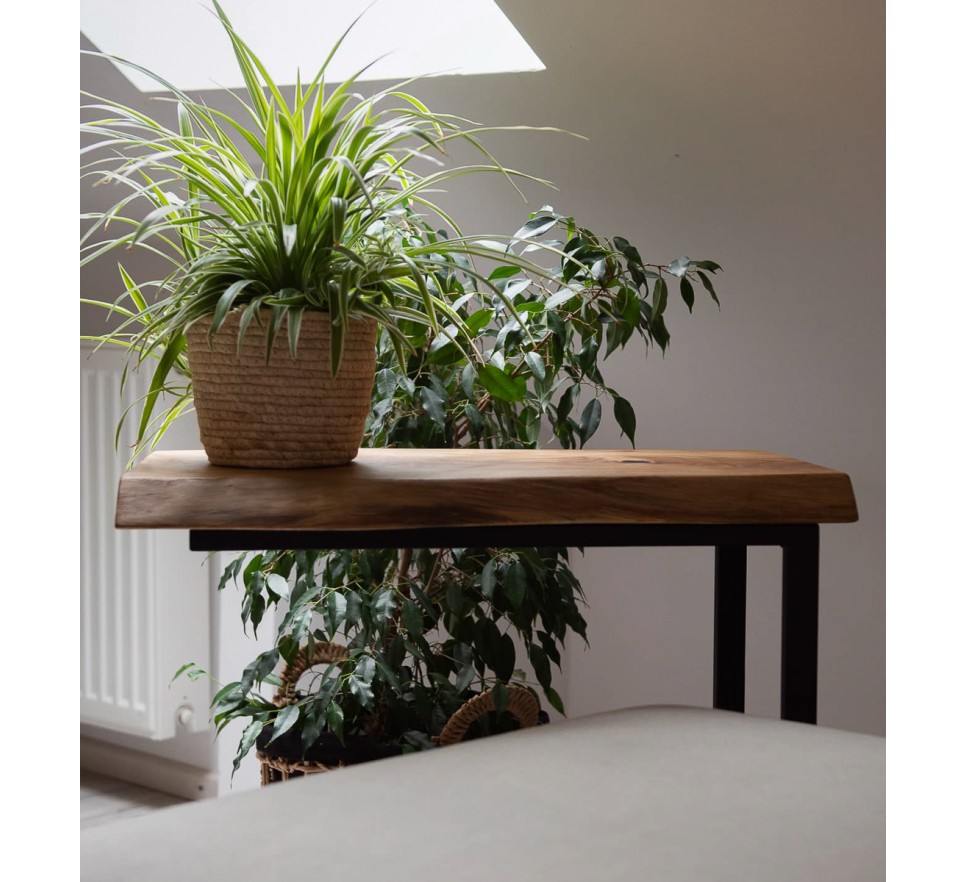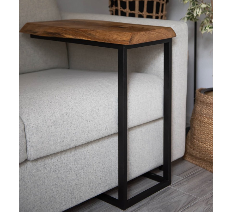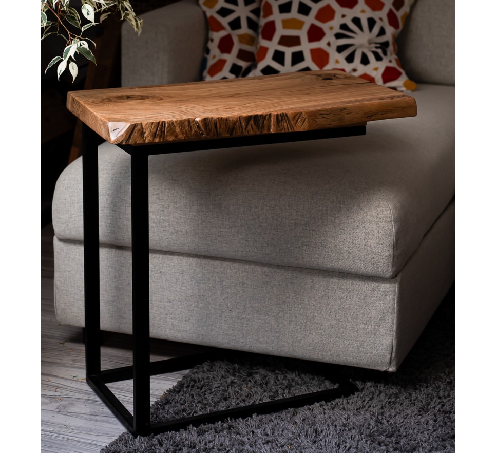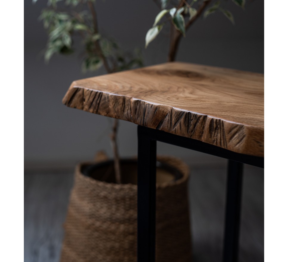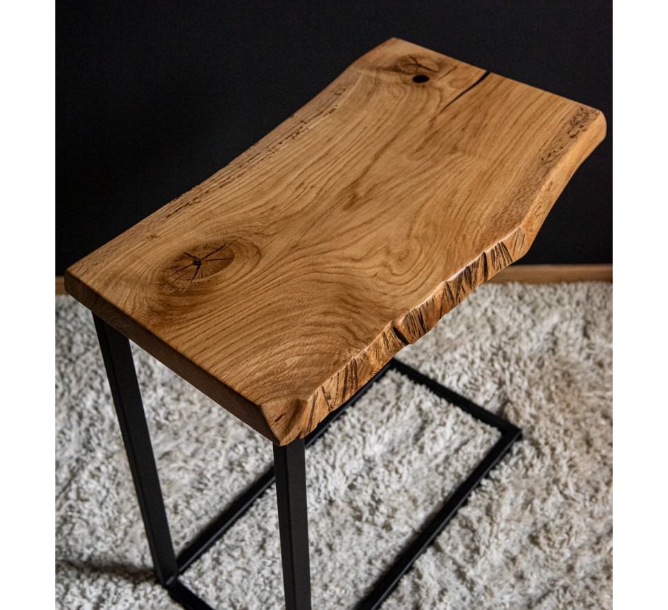 Stolik pomocniczy z jednego kawałka litej dechy dębowej. Ma uwydatnione sęki, pęknięcia i zachowaną naturalną krzywiznę krawędzi. Stelaż metalowy, malowany proszkowo.