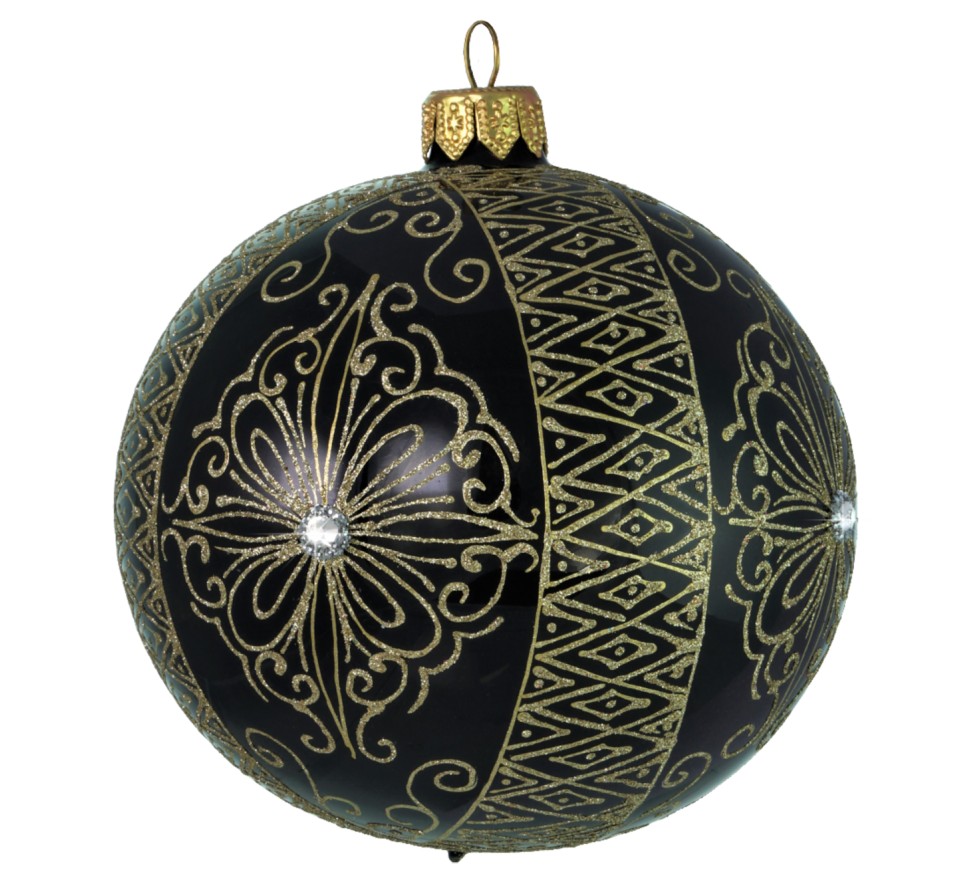 Elegancka bombka choinkowa w kolorze czerni, ozdobiona misternymi złotymi wzorami i lśniącymi kryształkami, doda Twojej choince wyjątkowego blasku. Wykonana z dbałością o detale, stanowi idealne połączenie klasyki i luksusu. Doskonała jako pojedyncza dekoracja lub element świątecznego zestawu.