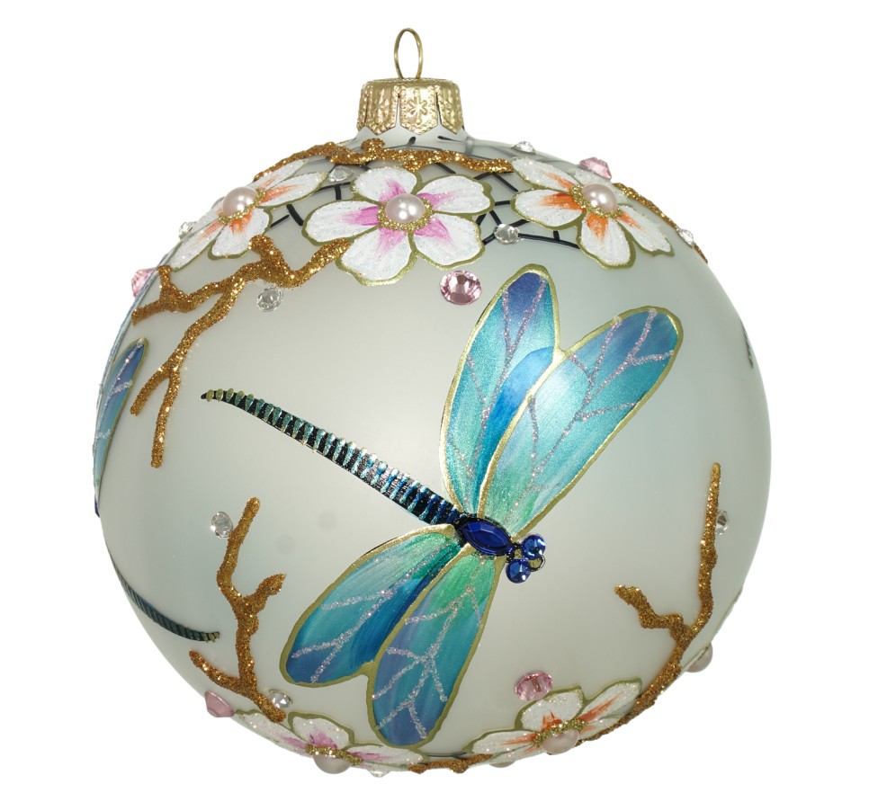 Bombka z ważkami i kwiatami wiśni zachwyca subtelnym, orientalnym motywem, który wprowadza do wnętrza delikatność i harmonię. Połączenie lekkich ważek z kwiatami sakury tworzy elegancką, romantyczną kompozycję. Idealna na prezent lub choinkę - doda jej finezji i niepowtarzalnego uroku.