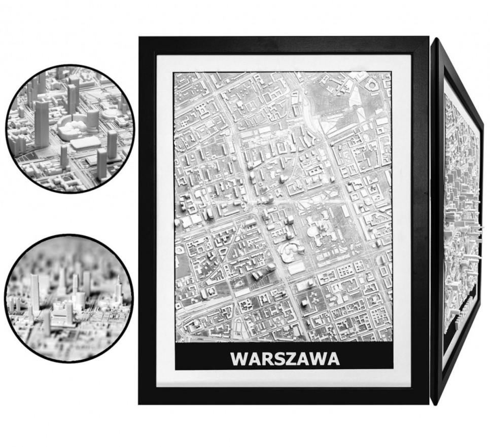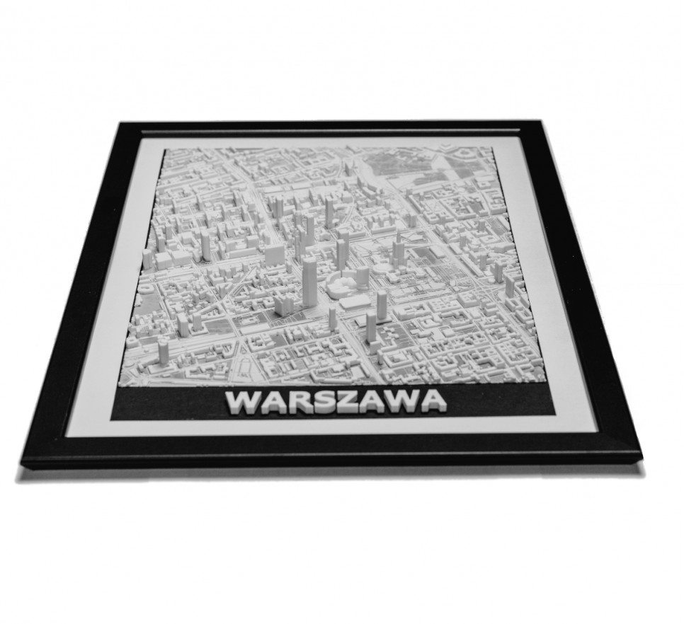 Obraz prezentuje trójwymiarowy plan Warszawy w czarnej, drewnianej ramie.