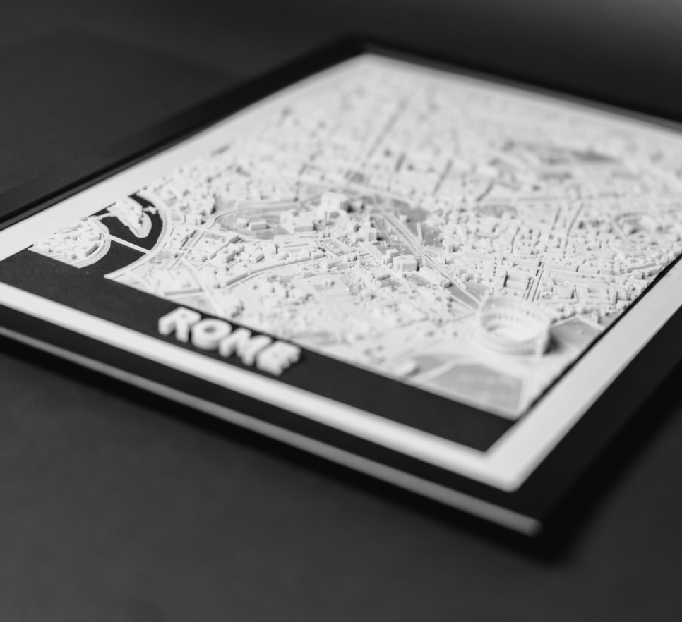 Obraz prezentuje trójwymiarowy plan Rzymu w czarnej, drewnianej ramie.
