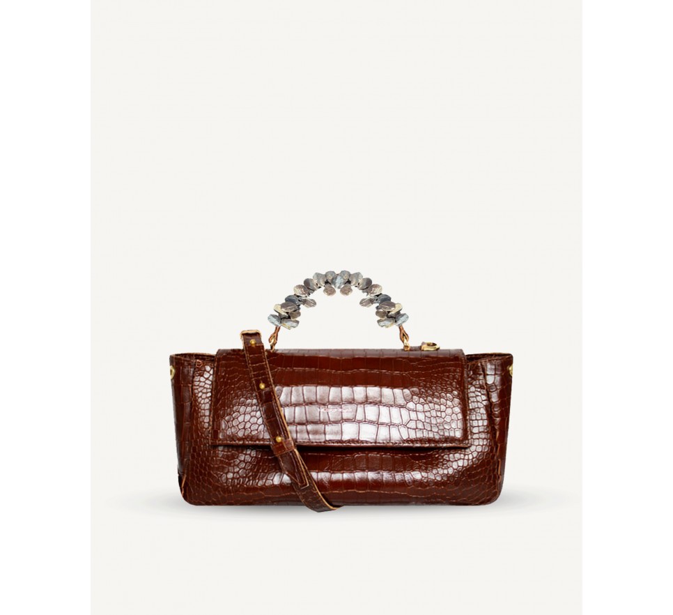 Torebka wykonana z naturalnej lakierowanej skóry tłoczonej na wzór krokodyla, wykończona materiałową wodoodporną podszewką. Zapinana na dwa magnesy i suwak. W środku znajdują się dwie kieszenie, duża kieszeń wielkości torebki, zapinana na suwak pod klapą i otwarta wewnątrz torby przedzielona na pół. Na zewnętrznej stronie torby duża kieszeń zapinana na suwak. Rączka ozdobiona ręcznie przyszywanymi naturalnymi słodkowodnymi perłami w kremowym kolorze . Na dnie pięć metalowych nóżek, które chronią torbę przed zniszczeniem. Posiada skórzany pasek z dużą możliwością regulacji długości.
