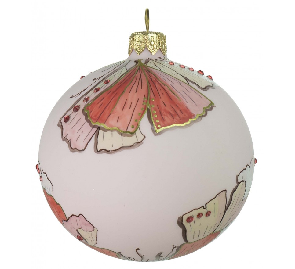 Minimalistyczna i subtelna bombka w różowym odcieniu, ozdobiona delikatnym motywem Ginko biloba w pastelowych barwach. Lekka, stonowana kolorystyka sprawia, że doskonale wpisuje się w klasyczne i nowoczesne aranżacje wnętrz.