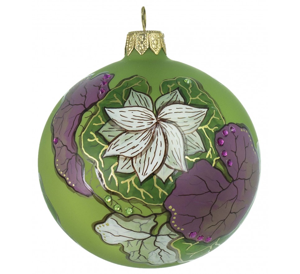 Wyrazista bombka w głębokim, zielonym kolorze z misternie malowanym motywem białej lilii i fioletowych kwiatów. Kontrast barw oraz precyzyjne kontury nadają jej szlachetnego charakteru. To wyjątkowa ozdoba dla osób ceniących naturę i artystyczne detale.