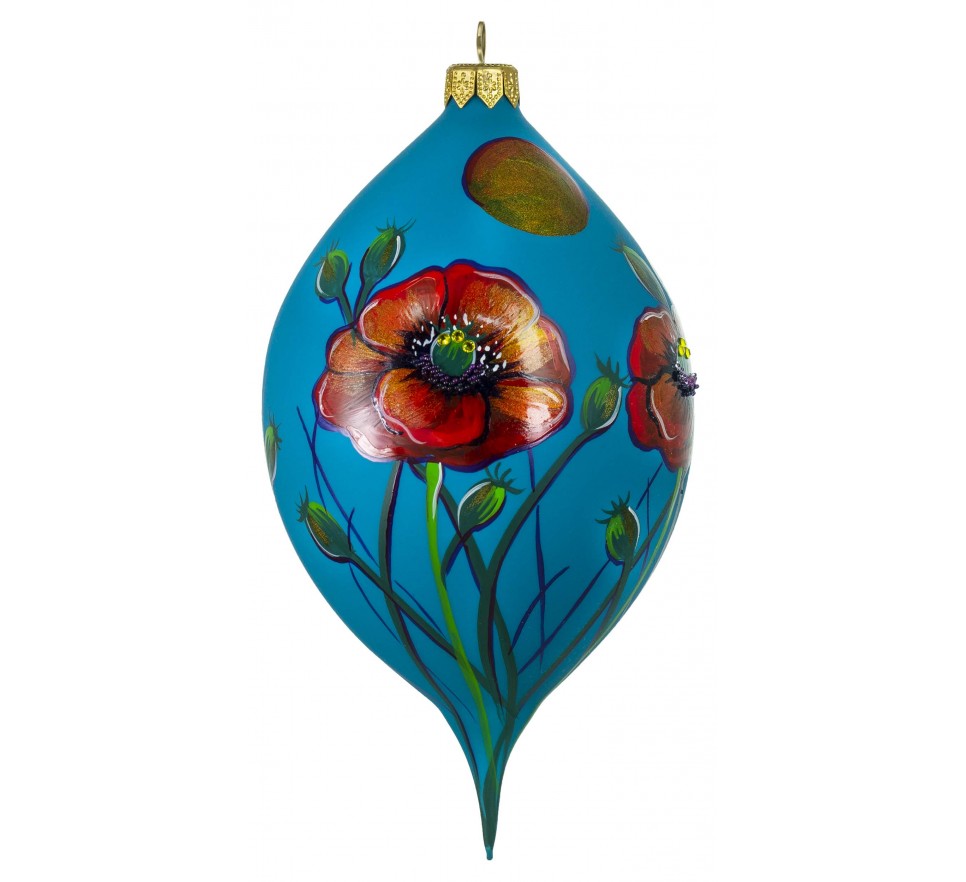 Wyjątkowa ozdoba w formie sopla w głębokim, turkusowym odcieniu, udekorowana ręcznie malowanym motywem czerwonych maków. Intensywny kontrast barw oraz delikatne detale nadają jej artystycznego charakteru i przyciągają spojrzenia. Smukła forma pięknie podkreśla lekkość wzoru, a subtelny połysk szkła dodaje elegancji.