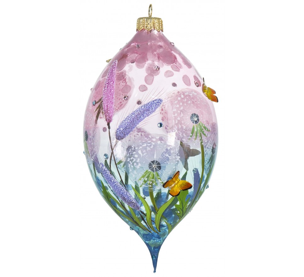Subtelny, sopel z ręcznie malowanym motywem delikatnych dmuchawców oraz motylkami. Lekka, transparentna forma pięknie eksponuje misternie wykonane detale, tworząc wrażenie zwiewności i naturalnej harmonii. Jasna kolorystyka i finezyjne zdobienia nadają całości świeżego, wiosennego charakteru.