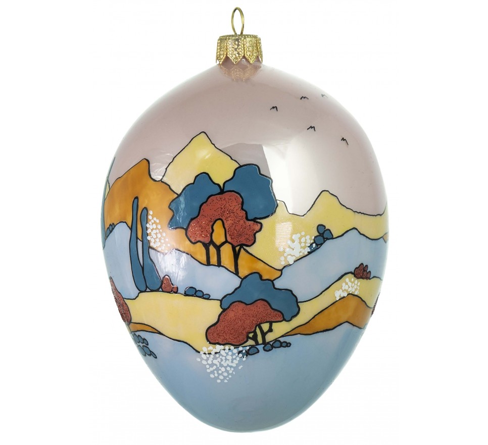Unikatowe, wolno dmuchane jajko szklane z malarskim motywem górskiego pejzażu w stylistyce vintage. Delikatnie przygaszona kolorystyka, subtelne przejścia barw i nostalgiczy charakter kompozycji przywołują klimat dawnych ilustracji i pocztówek.