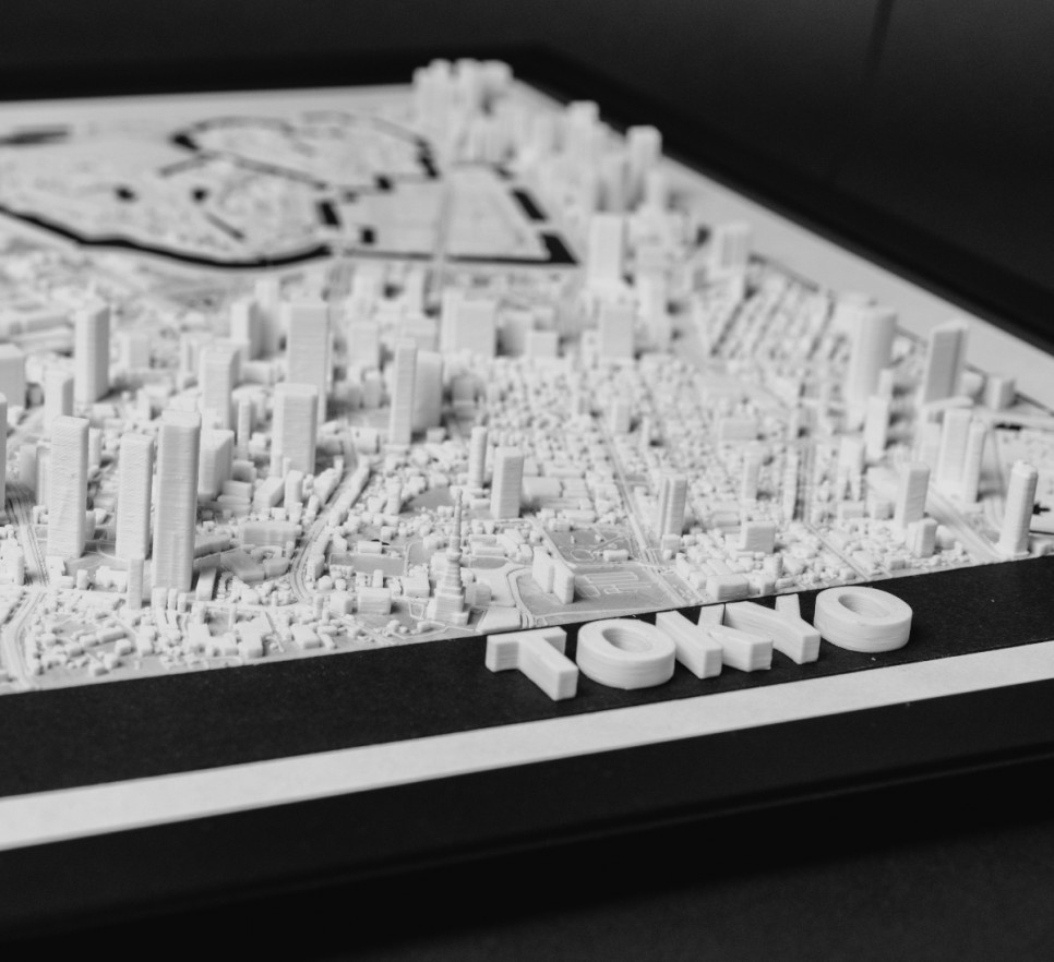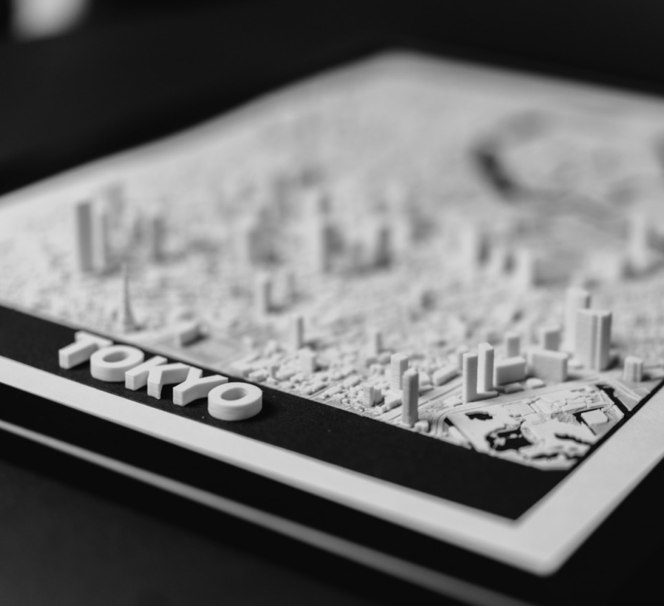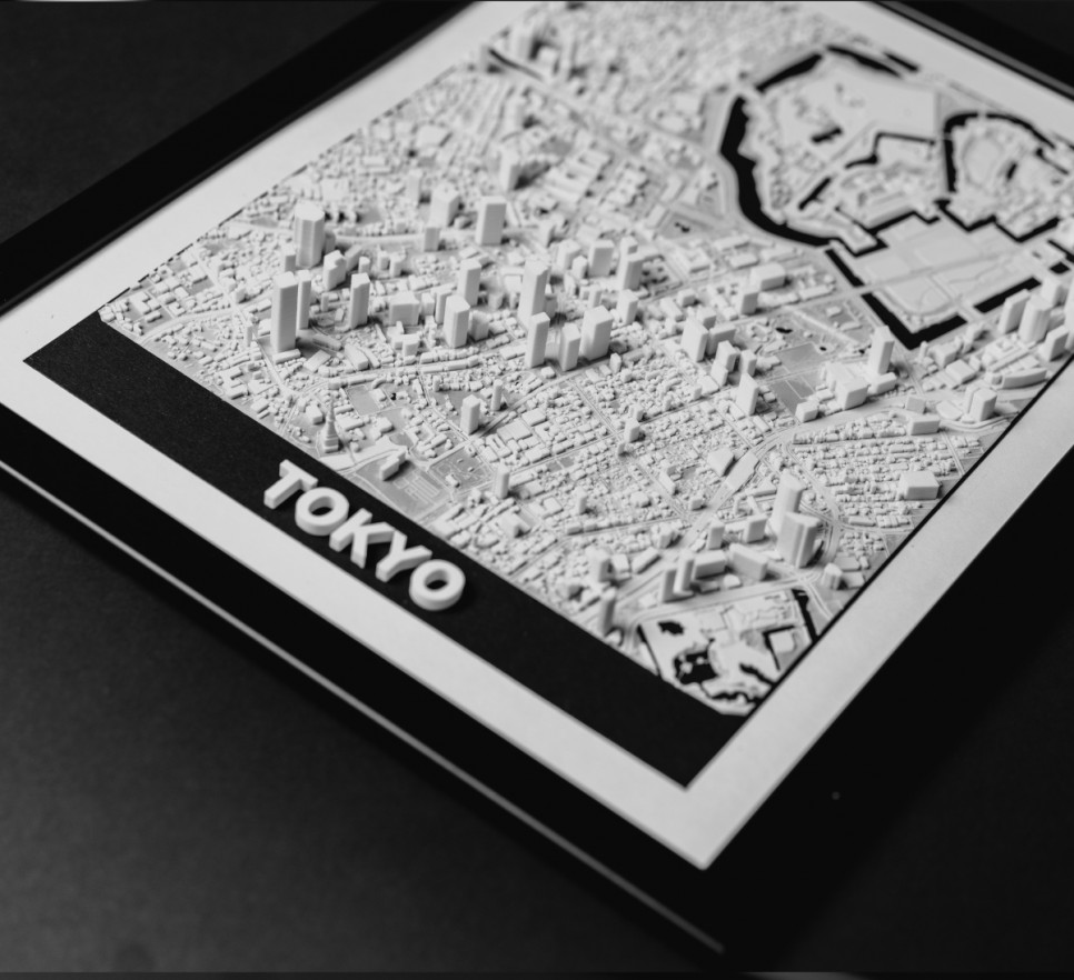 Obraz prezentuje trójwymiarowy plan Tokio w czarnej, drewnianej ramie.
