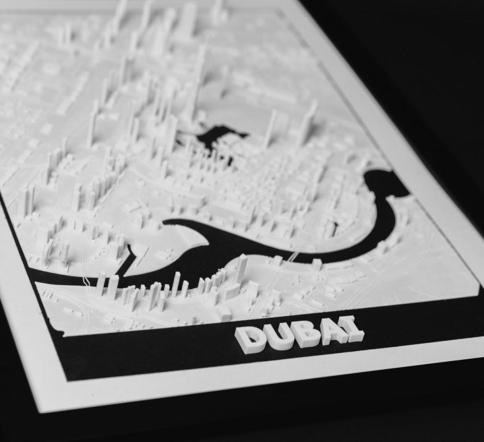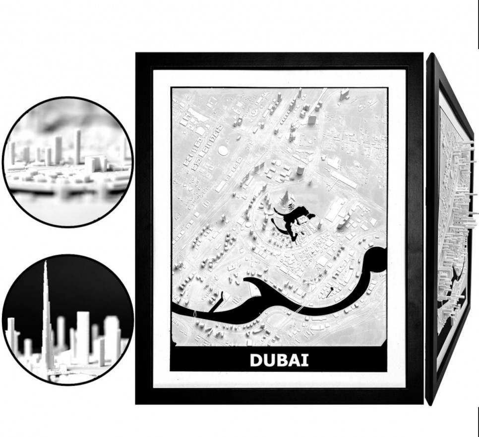 Obraz prezentuje trójwymiarowy plan Dubaju w czarnej, drewnianej ramie.