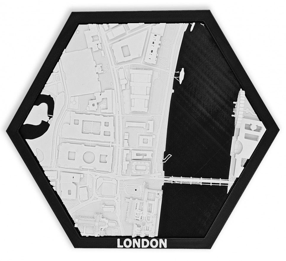 Obraz prezentuje trójwymiarowy plan Londynu w czarnej ramie z możliwością powieszenia.