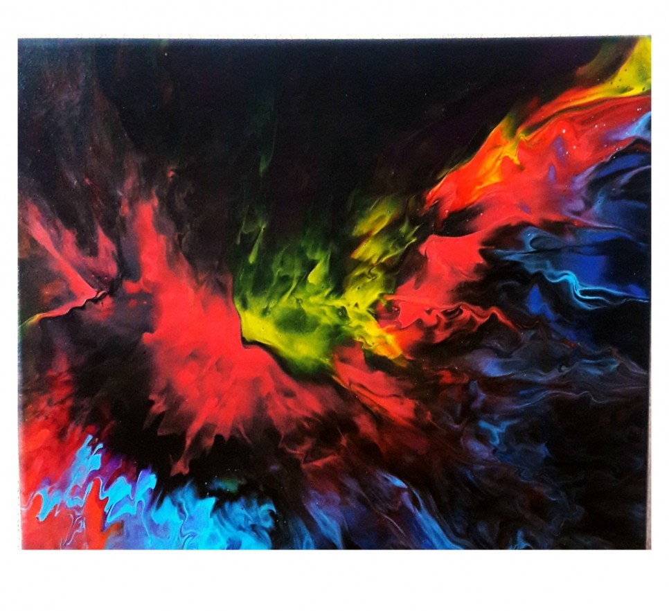 Abstrakcja w kolorach; czarny, czerwony, żółty, niebieski. technika pouring. Akryl na płótnie.