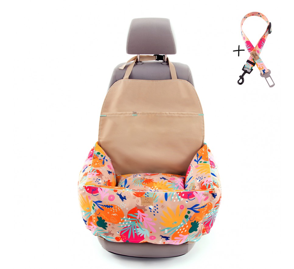 Fotelik można łatwo zamontować na siedzeniu samochodu przy pomocy pasków mocujących. Podwyższona konstrukcja pozwala psu obserwować otoczenie przez okno, co często zmniejsza stres podczas jazdy. Stylowy design z kolekcji Hau Are You Summer doskonale pasuje do nowoczesnych wnętrz samochodu.