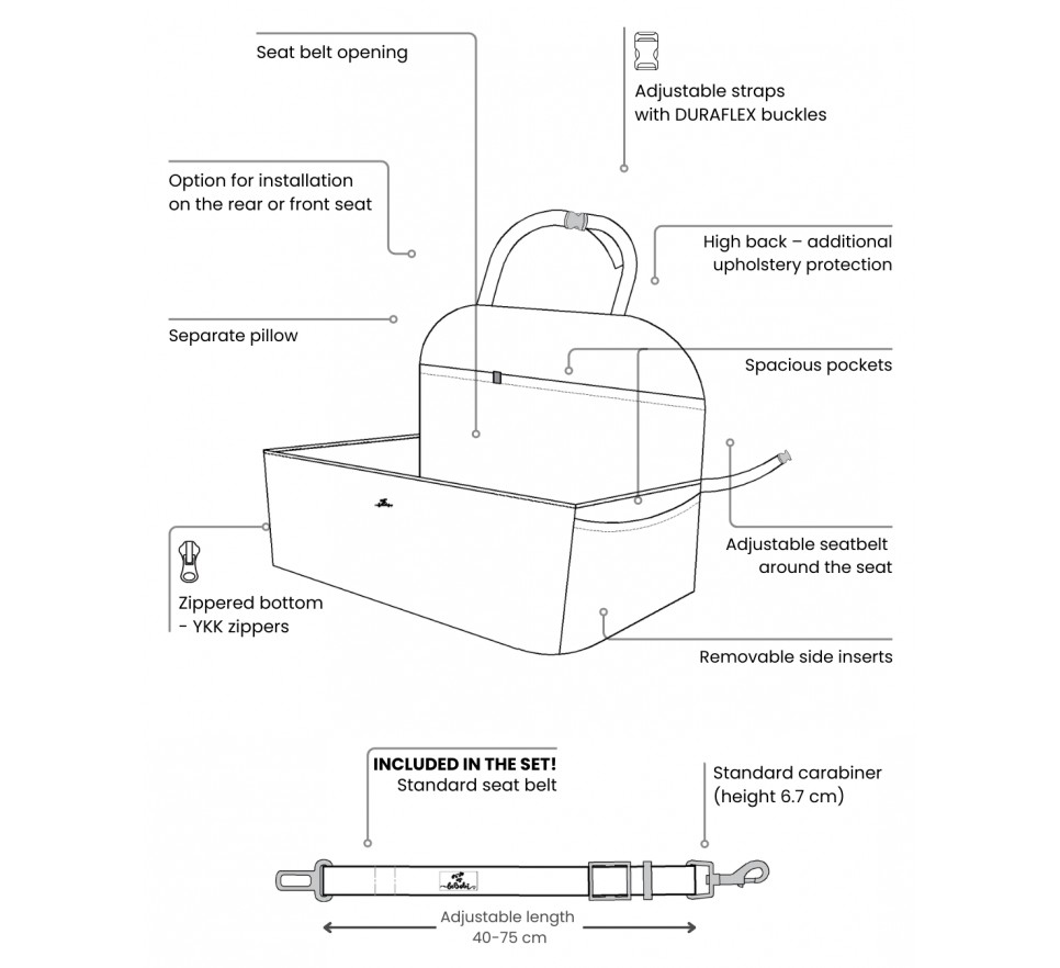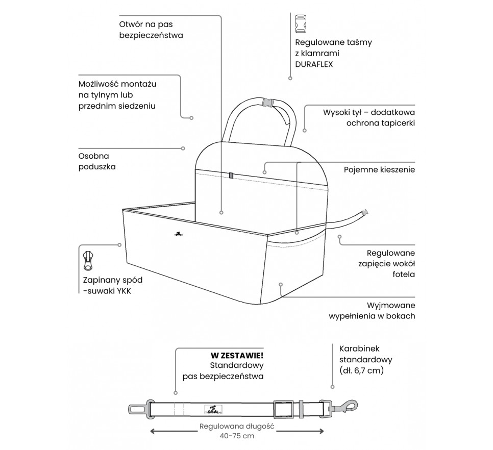 Miękkie, przyjemne w dotyku materiały oraz solidna konstrukcja sprawiają, że pies może wygodnie odpoczywać podczas jazdy, jednocześnie pozostając w bezpiecznej pozycji. Wbudowany pas bezpieczeństwa umożliwia przypięcie pupila do obroży lub szelek, co zapobiega przemieszczaniu się zwierzęcia w trakcie podróży.